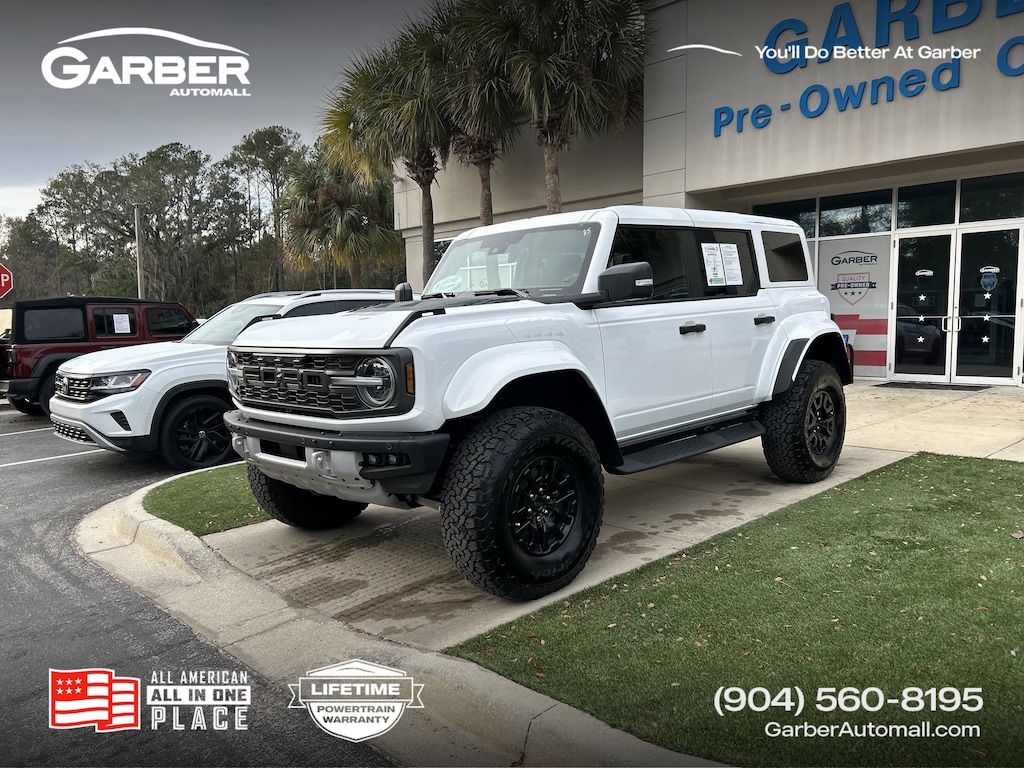 2025 Ford Bronco Raptor Oxford White WINDOW TINT, 12 Speakers, 4-Wheel Disc Brakes, ABS brakes, Auto High-beam Headlights, Auto-dimming Rear-View mirror, Automatic temperature control, Body Color-Painted Hard Top, Compass, Connected Navigation, Convertible HardTop, Convertible roof lining, Driver vanity mirror, Electronic Stability Control, Emergency communication system: 911 Assist, Equipment Group 374A Lux Package, Exterior Parking Camera Rear, Front Bucket Seats, Front dual zone A/C, Front fog lights, Front reading lights, Fully automatic headlights, Garage door transmitter, Hard Top Sound Deadening Headliner, Heated door mirrors, Heated front seats, Heated steering wheel, Illuminated entry, Integrated roll-over protection, Internet access capable: FordPass Connect, Leather Shift Knob, Low tire pressure warning, Navigation system: Connected Navigation, Outside temperature display, Overhead console, Passenger vanity mirror, Power door mirrors, Power windows, Radio: B&O Sound System by Bang & Olufsen, Rear-Window Defroster & Washer, Remote keyless entry, Security system, SiriusXM w/360L, Speed control, Split folding rear seat, Steering wheel mounted audio controls, SYNC 4, Telescoping steering wheel, Tilt steering wheel, Wheels: 17" Black High Gloss-Painted Aluminum.